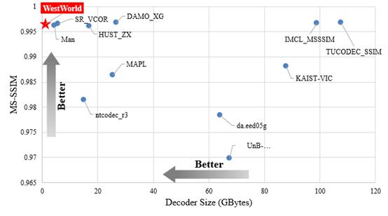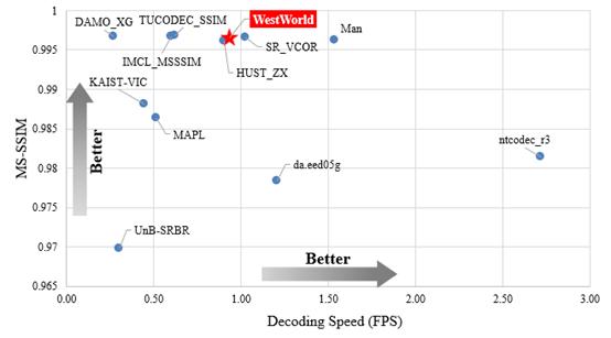 本次大赛中,基于深度学习的视频压缩作为一个全新的赛道,在对传输码流大小进行严格限制的情况下,以MS-SSIM作为主要评价指标衡量方案的压缩性能。何刚老师带领WestWorld团队结合传统编解码的特性,创新性地将深度学习“过拟合”方式应用于视频压缩,并且设计出鲁棒的码率控制算法大幅提升压缩效率,在竞赛中主观评价指标MS-SSIM的结果在所有参赛队伍中处于前列(与第一名TUCODEC_SSIM仅差0.00025)。此外,该方案在解码器的轻量化及解码速度上取得了重大突破,在与前三名MS-SSIM相近的情况下,该方案的解码器大小在所有队伍中最小,如图2所示;且该方案的解码速度均快于前三名,如图3所示。