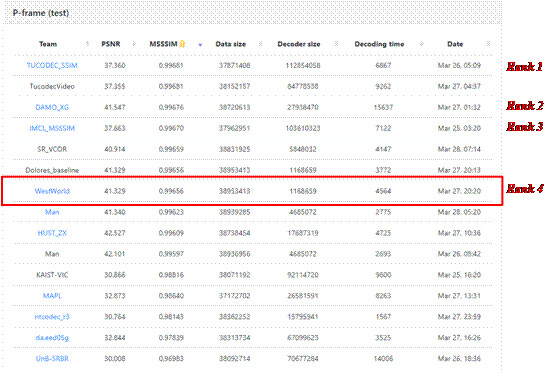 图像传输与处理研究所(图像所)骨干成员,图像所隶属于ISN国家重点实验室,负责人为李云松教授。下图为各队伍成绩排名情况(队伍名蓝色为认定有效参赛队及有效参赛成绩)。//challenge.compression.cc/leaderboard/pframe/test/