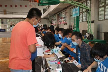 在体育馆内布置了迎新报到点,志愿者为新生们答疑解惑,发放入学指南、一卡通、口罩、温度计等开学必备物品,整个新生报到流程有序、暖心。