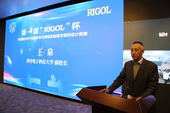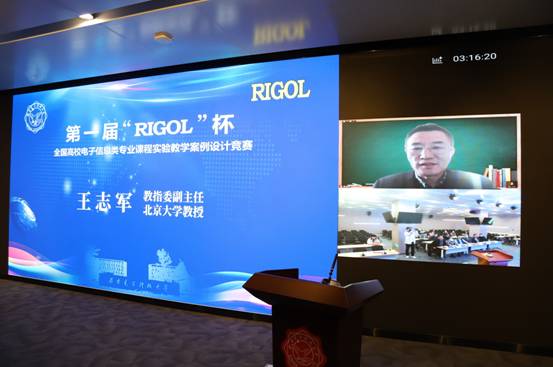 2021年10月24日下午,在西安电子科技大学北校区会议中心举行了颁奖典礼,并进行了线上线下直播,参与直播的教师人数达4000多人。在颁奖典礼上,西安电子科技大学副校长王泉教授,电子信息类专业教指委副主任、北京大学王志军教授,示范中心联席会电子学科组组长、东南大学胡仁杰教授,普源精电科技股份有限公司运营副总裁朱峰先生分别线下和线上致辞,在颁奖结束后,由获得RIGOL杯的北京邮电大学尹良老师分享了获奖经验,由评审专家代表北京交通大学侯建军教授分享了案例设计方法,最后由评审委员会常务副主任陈彦辉教授对本届竞赛进行了总结。
