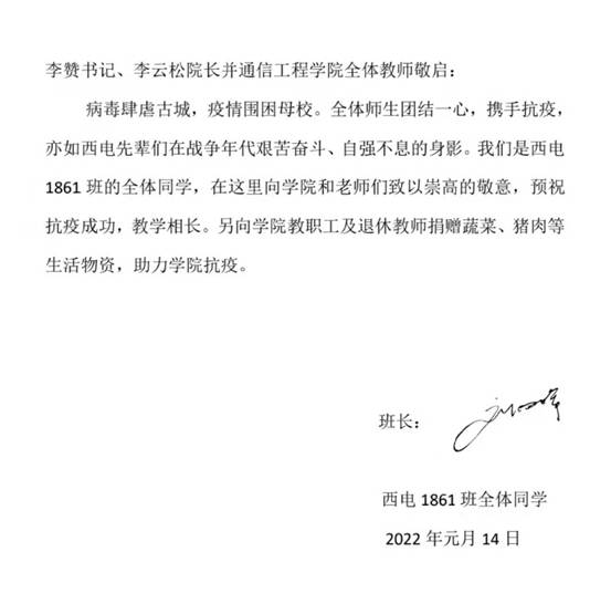 也时时收到校友的问候与帮助。1861班全体校友在这样特殊的时刻,心系母校,慷慨相助,展现了西电人高度的社会责任感和浓厚的爱国爱校情怀,彰显着西电人同舟共济、守望相助的深厚情谊。春可期,疫可除,万众一心,抗疫必胜。