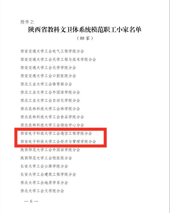 (通讯员 王思阳)近日,陕西省教科文卫体工会委员会下发《关于表彰陕西省教科文卫体系统模范职工之家、模范职工小家、优秀工会工作者、优秀工会积极分子、优秀工会之友的通报》,西安电子科技大学工会爱体育