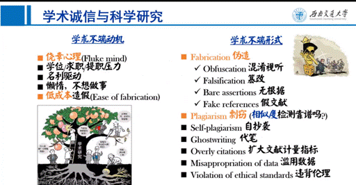 在学术诚信与科学研究方面,范平志从学术不端产生的动机进行探究,并就学术不端的具体表现形式同与会老师进行了交流,并严格强调了学术不断的严重后果。他指出,研究生培养过程一定要让学生意识到学术不端所带来的灾难性后果,并就如何避免学术不端问题出现,对类似可能情况如何避免提出了自己的建议措施。