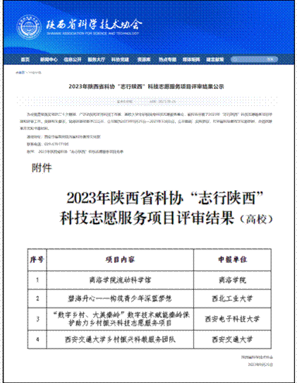 (通讯员 韩静)近日,陕西省科学技术协会发布《2023年陕西省科协“志行陕西”科技志愿服务项目评审结果公示》,共有6个项目入选,其中高校项目4个。爱体育官网
