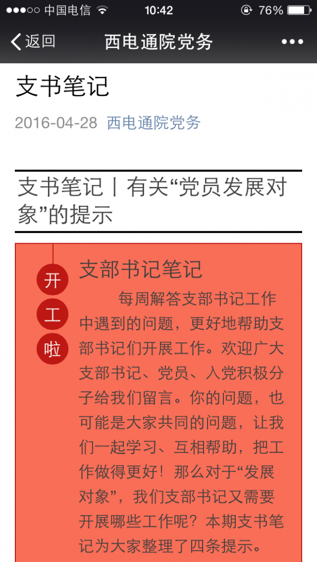 网站设立了“两学一做”专栏,及时上传更新学习材料。同时,搭建“西电通院党务”微信平台,以“规范、透明、深度、及时”为目标,服务全院党员干部经常性学习,增强基层党组织的凝聚力和战斗力。具体推送“学习文选”、“干部必读”、“党员亮牌”三个栏目的学习教育内容,展示“支部特色”、“关爱引领”、“开放教学点”、“党课预约”四个栏目的支部工作情况,举行“周周练”、“开奖啦”两个栏目的线上党史普及竞赛活动,真正做到线上线下一盘棋,营造氛围来学习。(通讯员 李警)
